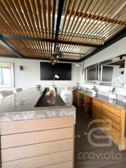 Planta arriba: Roof garden. Sala, dos comedores, aire acondicionado, cocina, área para asador, jacuzzi, pérgola y techo replegable, gimnasio, sauna.