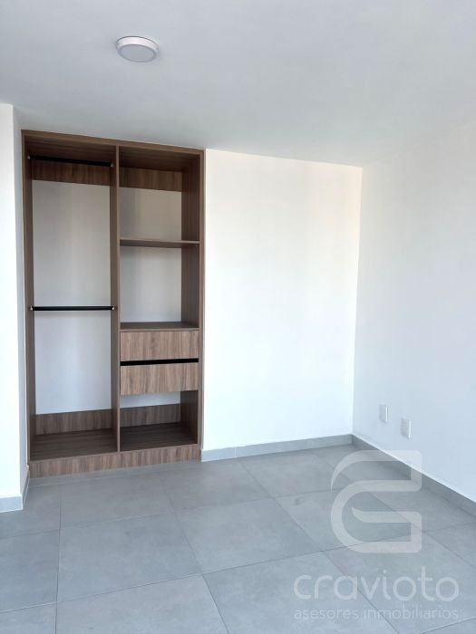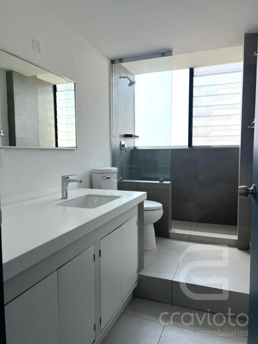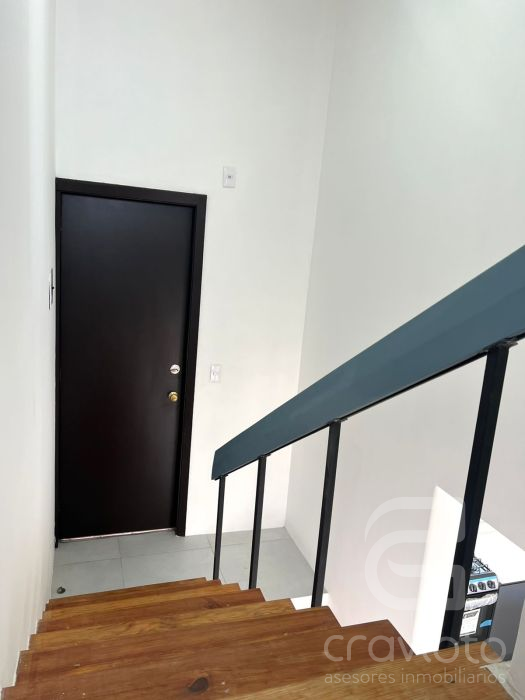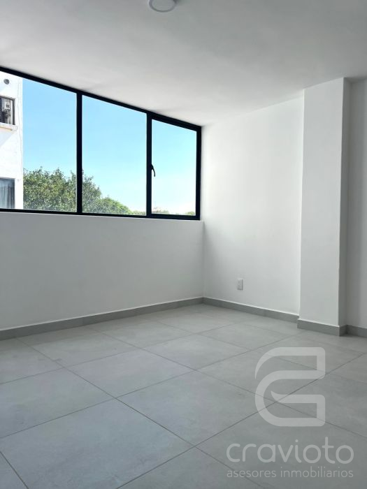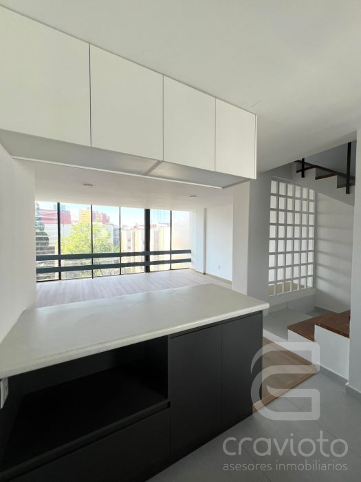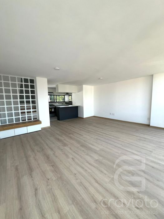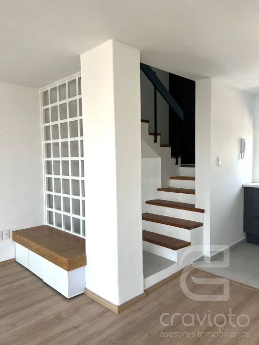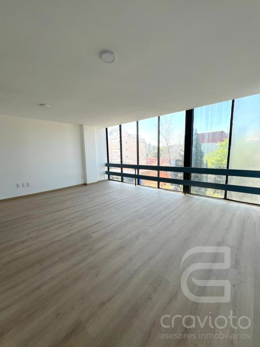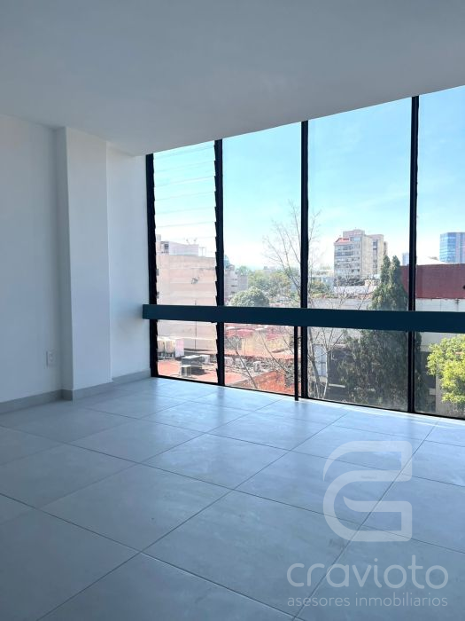 Consta de dos pisos. Hall de doble altura, medio piso hacia abajo: estancia y comedor con ventanales hacia Av. Coyoacán, cocina abierta, área para lavadora. Planta alta: dos recámaras con clóset que comparten baño completo.