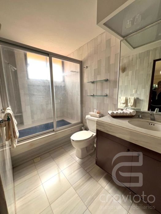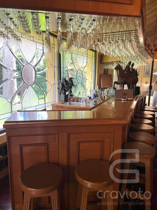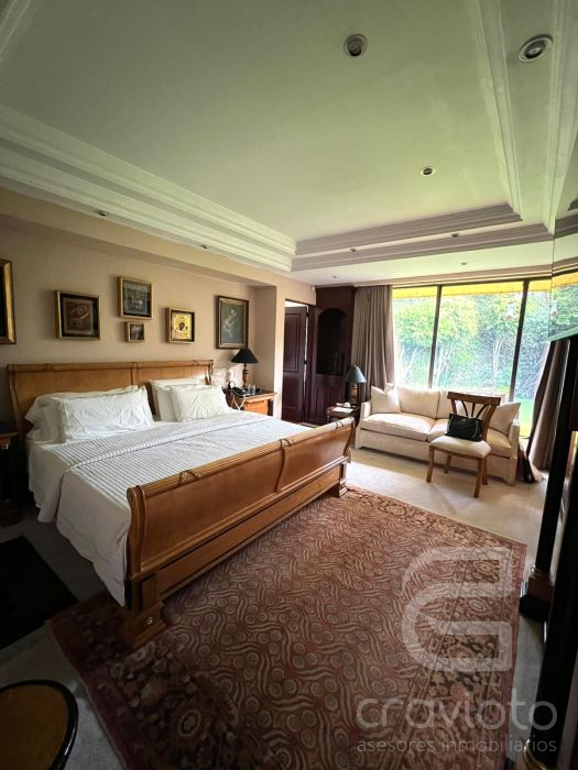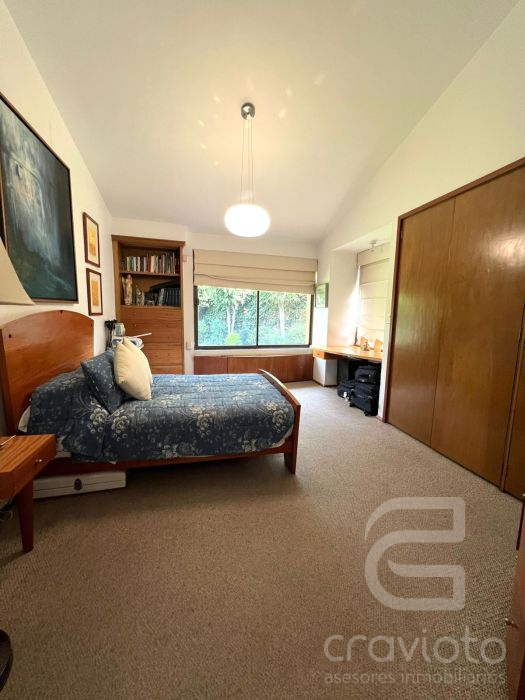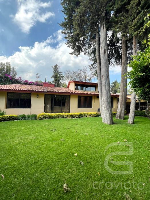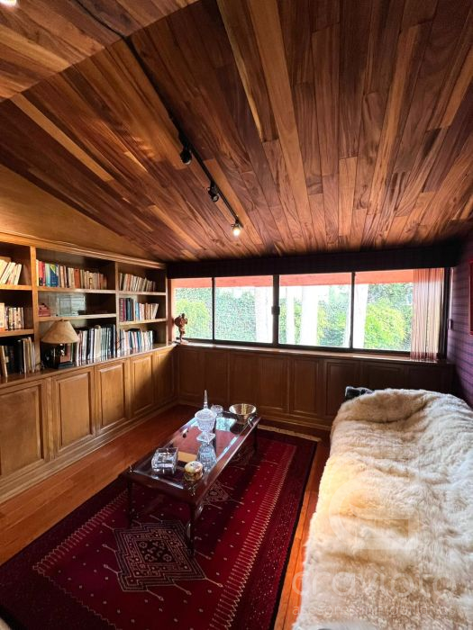 Consta de hall de recepción, cocina con desayunador, estancia con cantina empotrada y chimenea, comedor, sala de Tv, terraza, jardín, estudio o biblioteca, tres recámaras, la principal con vista y salida al jardín, amplio vestidor y baño, 2a recámara con clóset, baño completo y vista al jardín, 3a recámara con clóset y baño completo. clóset de visitas y blancos.