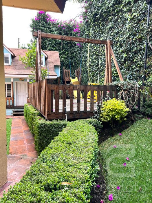 Garage techado con puertas eléctricas, circuito cerrado, bodega, cisterna grande. Espectacular casa de muñecas de dos pisos con servicios en el jardín, juegos infantiles privados.