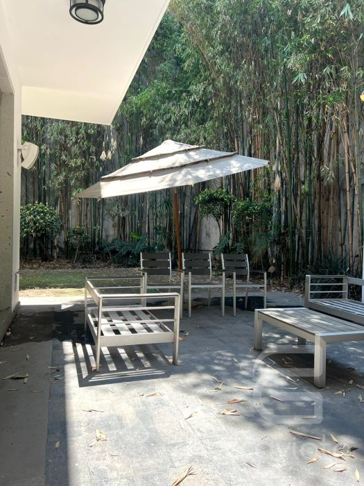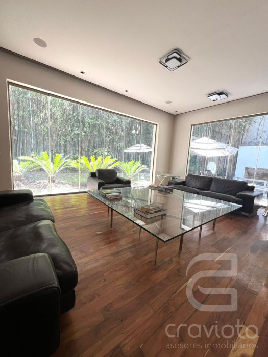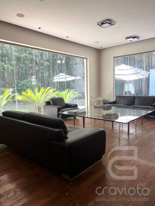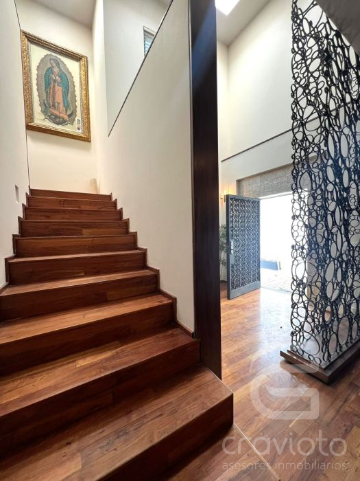Planta baja, Hall de doble altura, amplia estancia y comedor en escuadra con ventanales hacia el jardín, cava grande a un costado del comedor, baño de visitas, pantry, bar, cocina, terraza.
