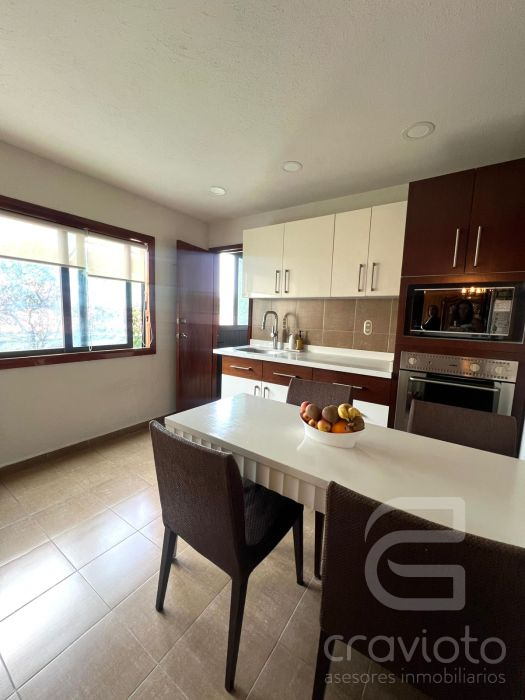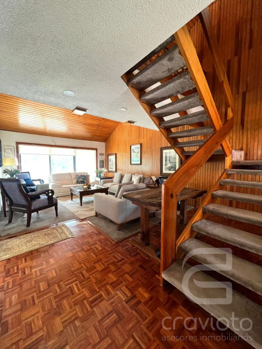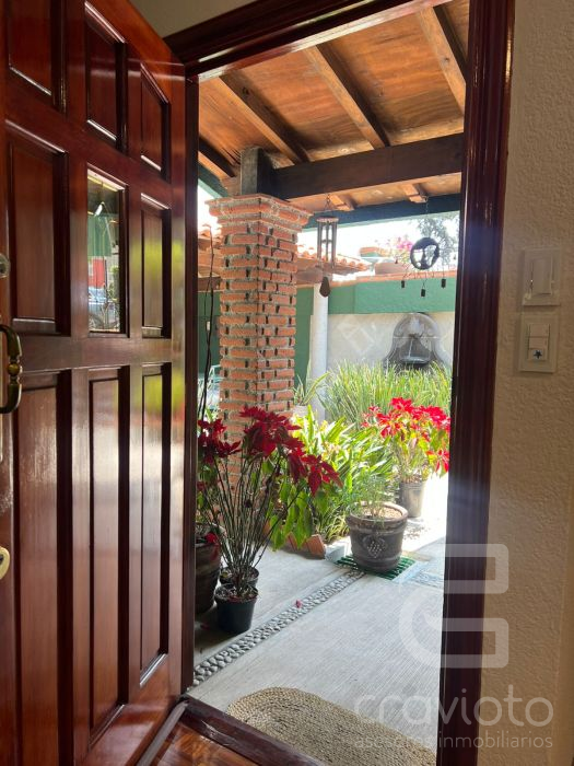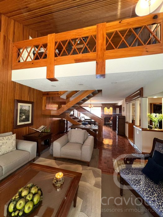 Planta Baja, Terraza, patio con fuente, estancia de doble altura con techos inclinados de madera, piso de parquet, comedor, bar, baño de visitas, oficina o estudio, cocina. Área de lavado, cuarto de servicio con baño completo.