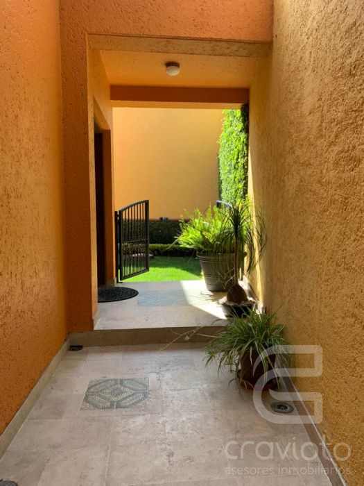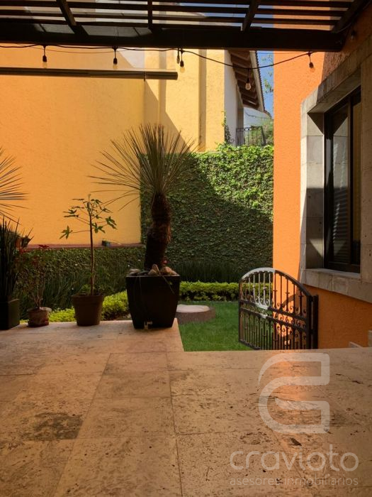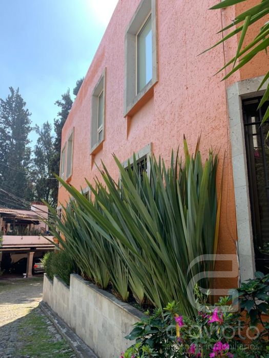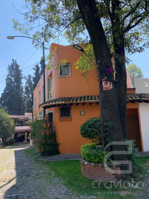 Preciosa casa que se encuentra en una calle empedrada típica de San Angel, misma que fue cerrada con una reja y caseta de vigilancia. En la planta baja consta de un amplio hall con doble altura, sala, comedor, cocina, antecomedor, family room, terraza que da al jardín, biblioteca, área de lavado y tendido. En la primera planta se encuentra la recámara principal con vestidor y baño, tina (todo muy amplio), chimenea. Las recámaras secundarias con vestidor y baño. En la zona del garaje tres estacionamientos techados, cuarto de servicio, dos baños de servicio, amplia bodega, cisterna. Excelentes acabados. Remodelada hace 10 años.