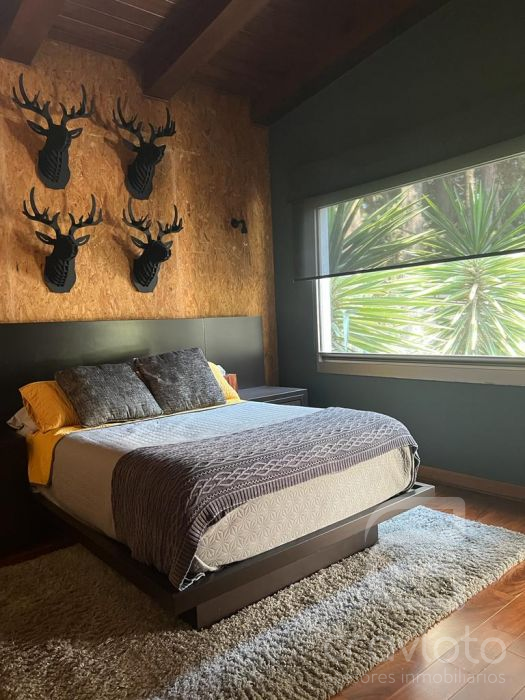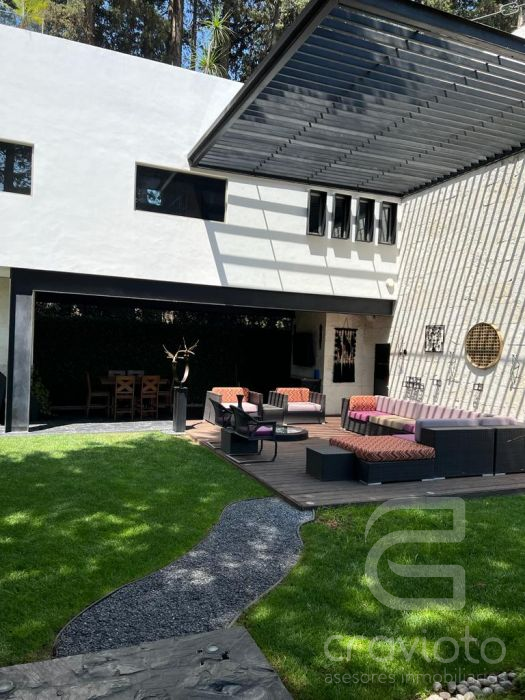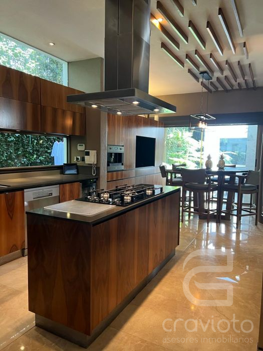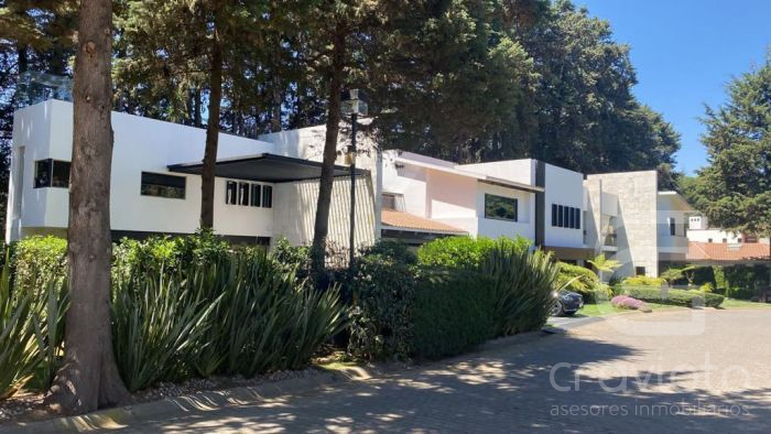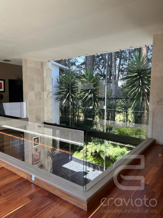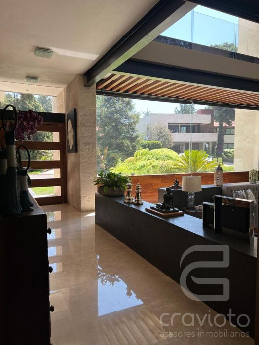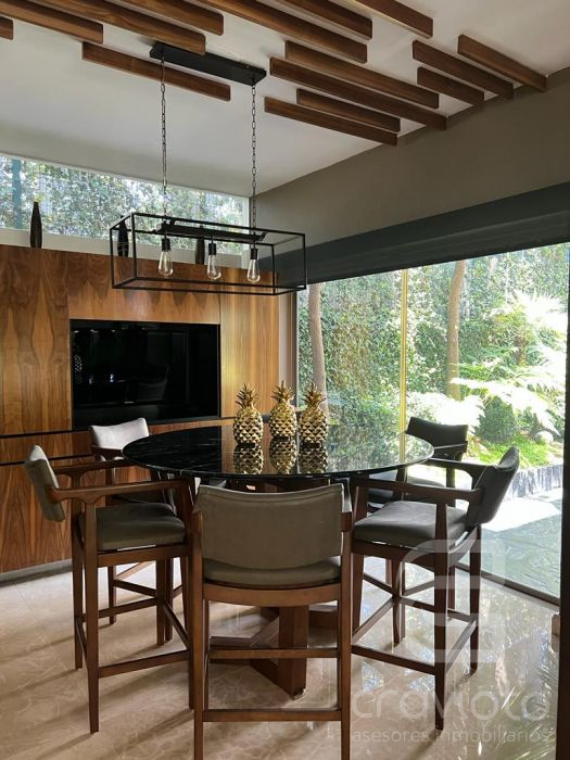 Estancia principal con doble altura, ventanales con vista boscosa, comedor, cava subterránea, terraza, dos chimeneas de gas, cocina equipada, desayunador, sala de TV, dos despachos, baño de visitas, acabados de lujo.
