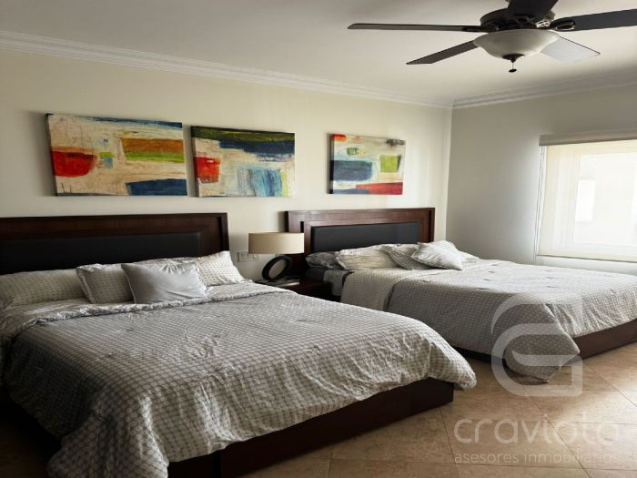 2 recámaras, principal cama king size y baño integrado y la otra con dos camas matrimoniales.