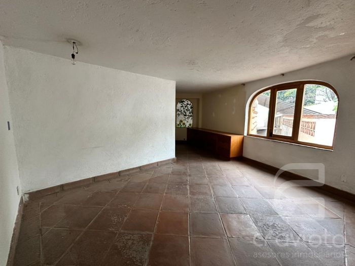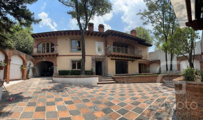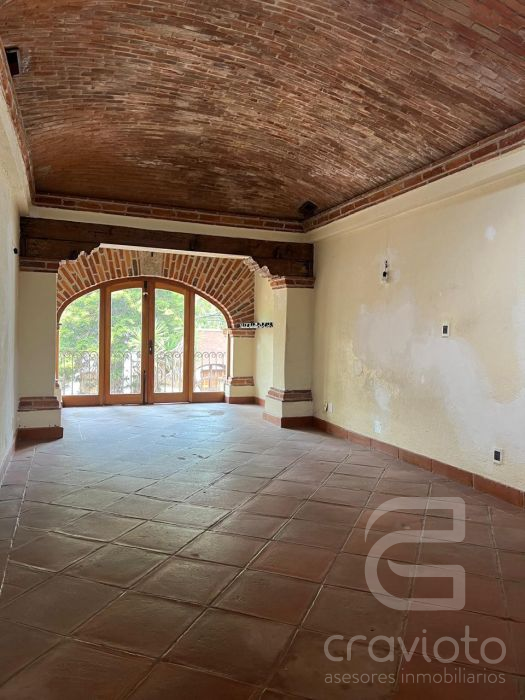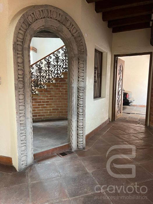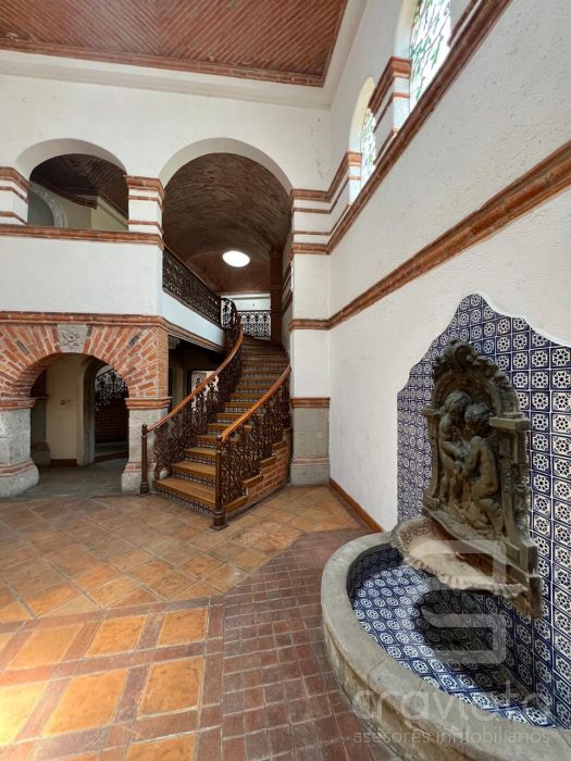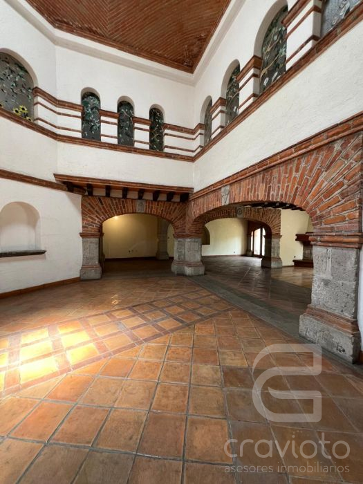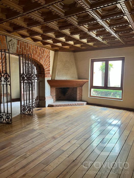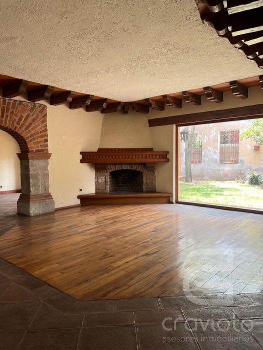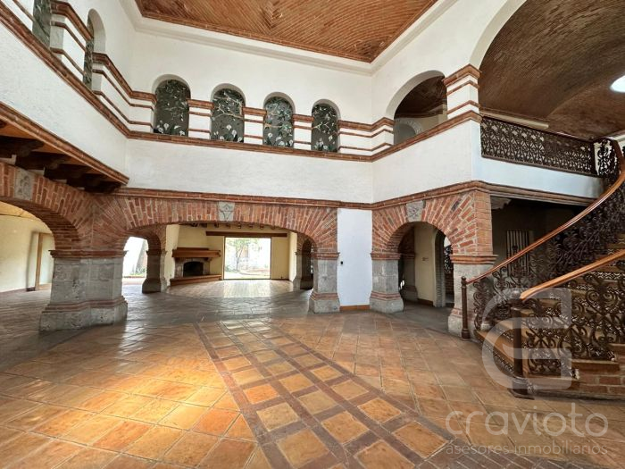 Planta baja: estancia con chimenea, vestíbulo de doble altura, amplio comedor con terraza al jardín, segunda estancia o biblioteca con chimenea, baño de visitas, cocina, dos alacenas, bodega,