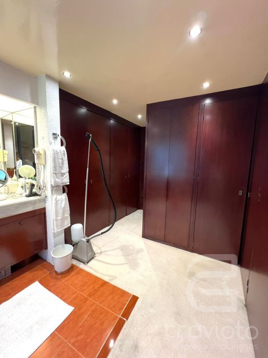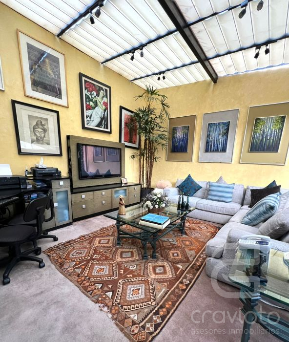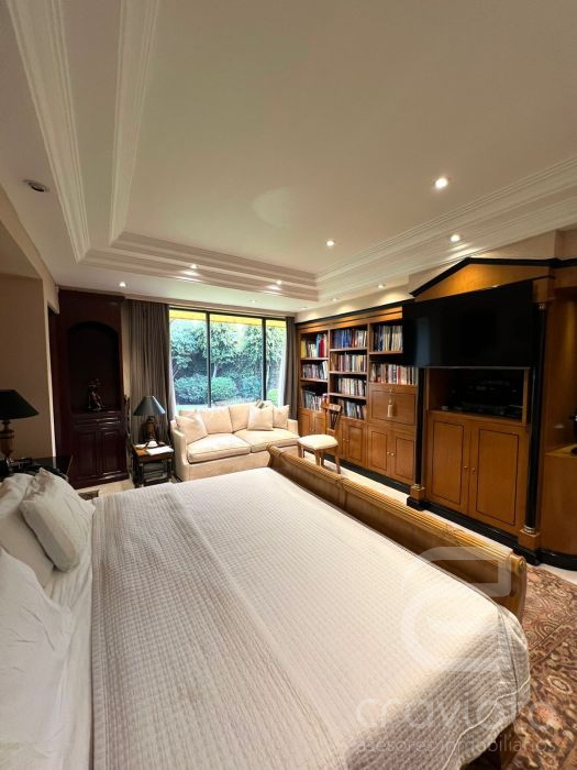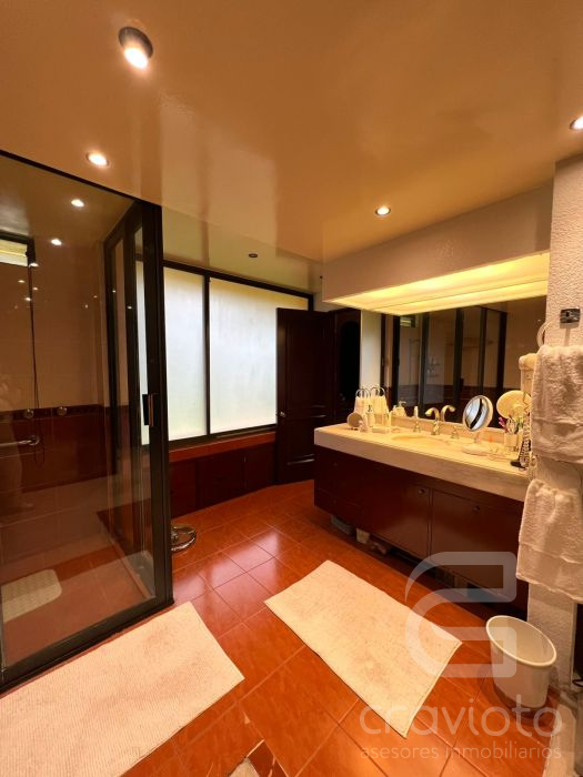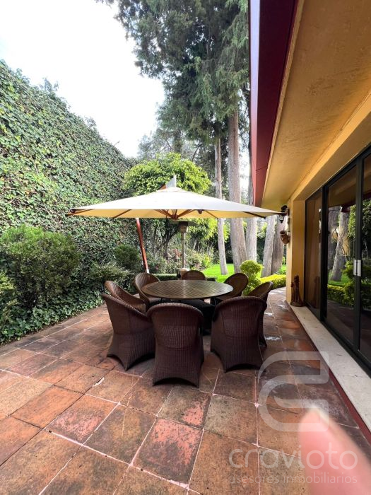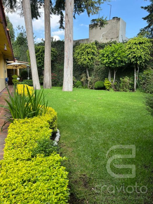 Consta de hall de recepción, cocina con desayunador, estancia con cantina empotrada y chimenea, comedor, sala de Tv, terraza, jardín, estudio o biblioteca, tres recámaras, la principal con vista y salida al jardín, amplio vestidor y baño, 2a recámara con clóset, baño completo y vista al jardín, 3a recámara con clóset y baño completo. clóset de visitas y blancos.