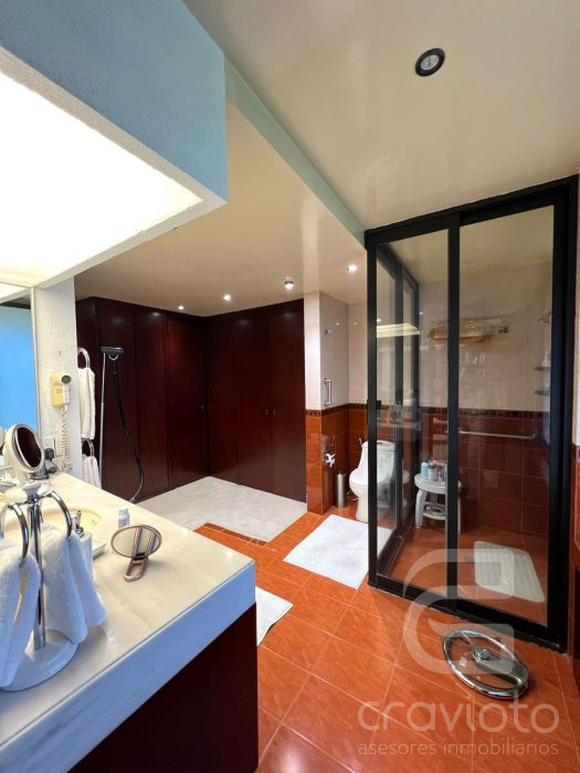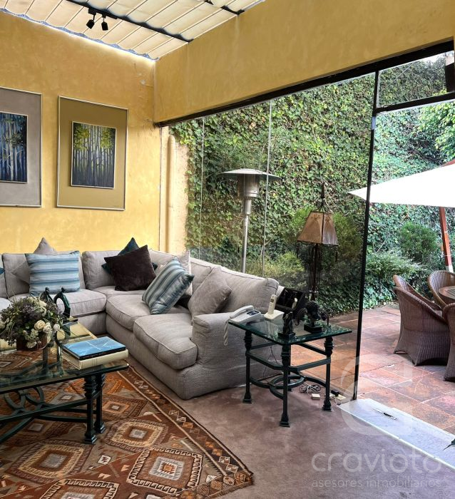 Ubicada en el Barrio de San Francisco. Casa en una sola planta con vista al jardín (100 -120 m2 aproximadamente) en su mayoría. Excelentes acabados, pisos de granito y madera. Techos inclinados de madera. Teja por fuera. Doble altura interior en estancia y techos altos. sensación de amplitud.