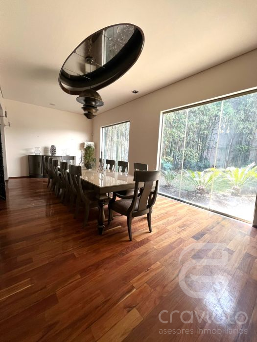 Planta baja, Hall de doble altura, amplia estancia y comedor en escuadra con ventanales hacia el jardín, cava grande a un costado del comedor, baño de visitas, pantry, bar, cocina, terraza.