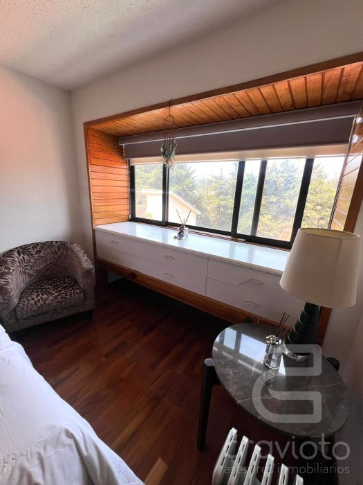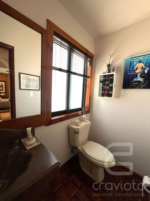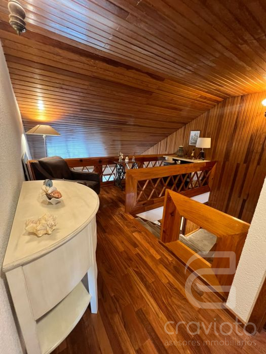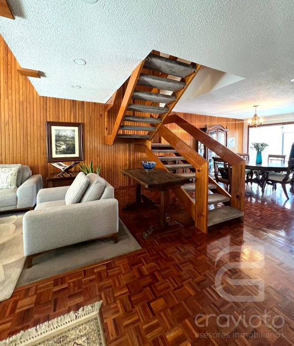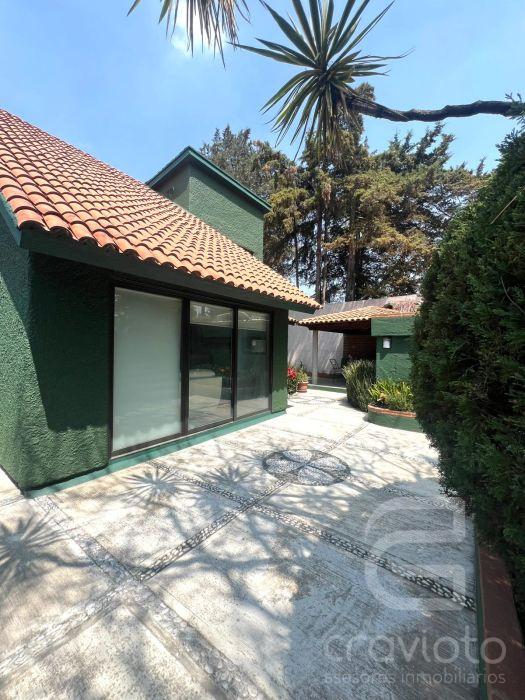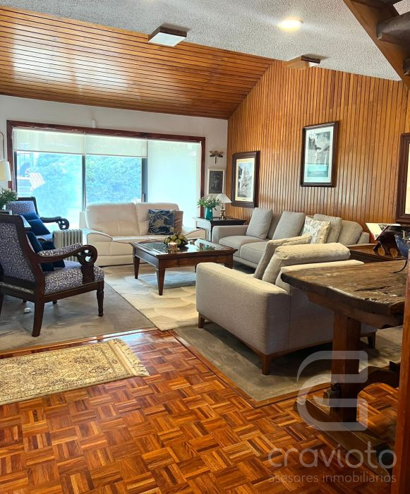 Planta Baja, Terraza, patio con fuente, estancia de doble altura con techos inclinados de madera, piso de parquet, comedor, bar, baño de visitas, oficina o estudio, cocina. Área de lavado, cuarto de servicio con baño completo.